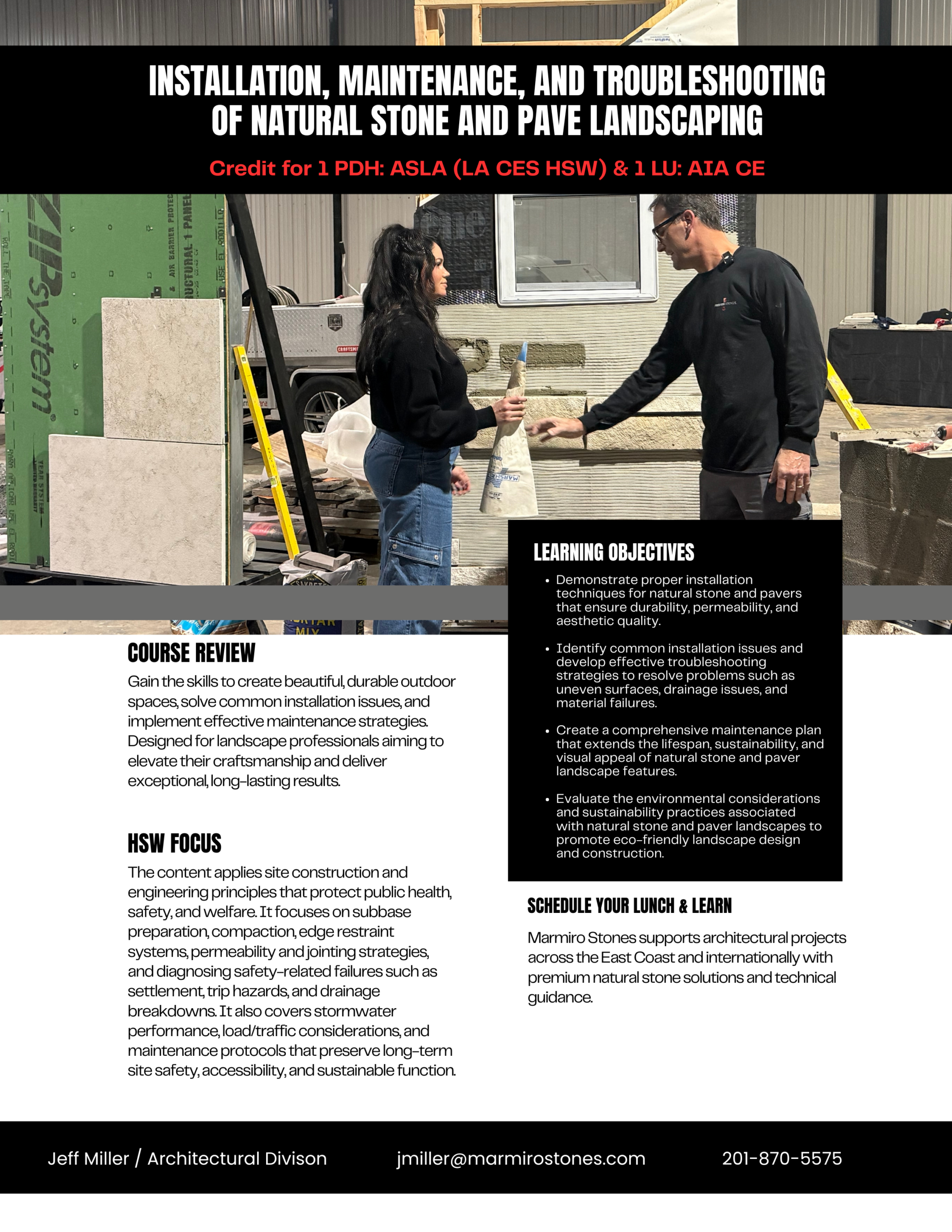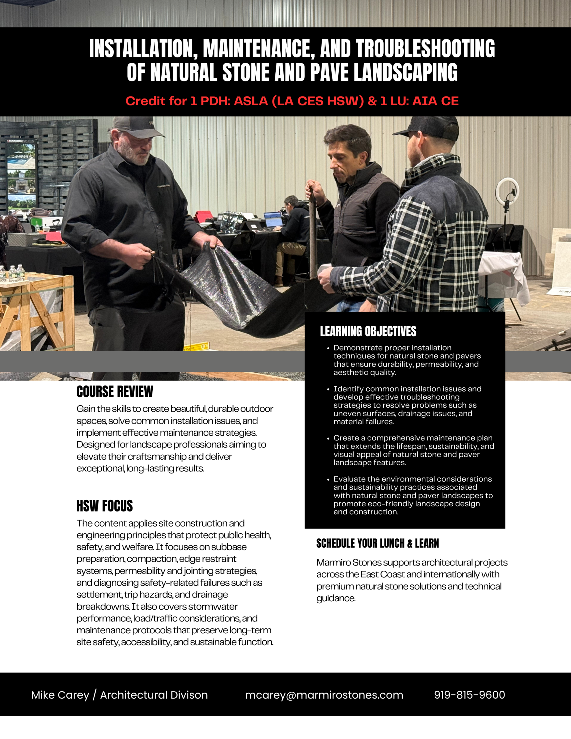 A key part of Jeff’s work is education and mentorship. As an AIA and ASLA member instructor, he regularly works with the design community to share insights on masonry systems, installation practices, and performance considerations. His approach is highly solutions-oriented and grounded in real-world field experience, allowing him to translate technical information into practical guidance for both designers and installers.